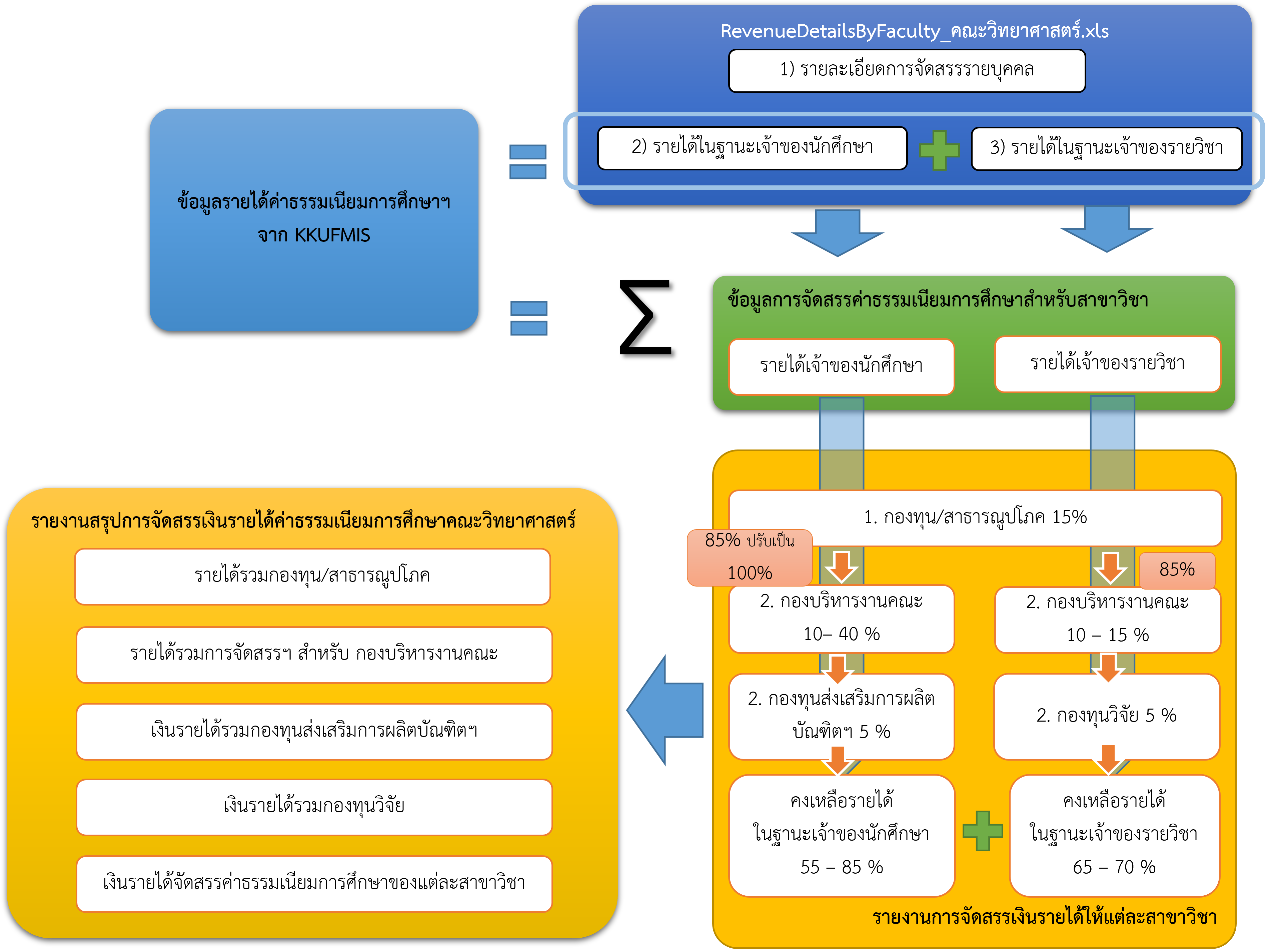 ระบบสารสนเทศเพื่อยกระดับการจัดสรรเงินค่าธรรมเนียมการศึกษา คณะวิทยาศาสตร์ มหาวิทยาลัยขอนแก่น พัฒนาโดยนำข้อมูลรายงานค่าธรรมเนียมการศึกษา จากสำนักทะเบียน มหาวิทยาลัยขอนแก่น มาจัดเก็บในระบบฐานข้อมูล เพื่อใช้ในการประมวลผลจัดทำรายงานการจัดสรรค่าธรรมเนียมการศึกษาภายในคณะวิทยาศาสตร์